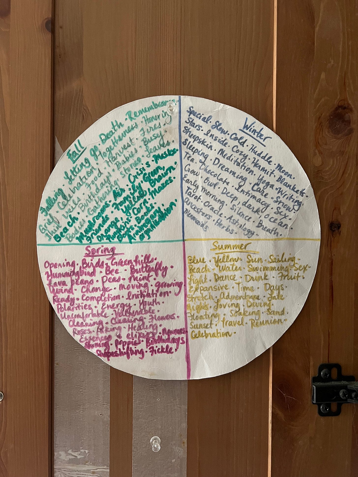 I’m at my kitchen table in Italy, my writing desk/armoire behind with doors closed because it’s now full of papers and art supplies and a huge old printer and everything else that my family of 5 can fit in it that there’s no other space for in our small apartment. It’s full and a mess. The corkboard on the inner doors have fallen off on one side, the other side is barely holding on as the corkboard has unattached at the bottom. But there are photos of Mimmo and I the night before our wedding, pictures of Salvatore when he was in the hospital and on the day that we let him go. The other side where the corkboard fell off and just the adhesive remains, I thumbtacked a seasonal mandala I made with Corporeal Writing. A circle divided into 4 seasons, filled with words in each season. I packed it in my bag with me this time to remind me to write. To remind me how writing is cyclical like the seasons, with different feelings, themes, associations in each division of time. It whispers to me from behind, of the book I’ve been writing for so long, that I spent pockets of time during summers visiting and working on it at that desk. It says begin again.